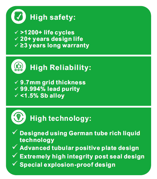 Placa: Placa de grade mais espessa do setor (9,7 mm); Liga de cálcio com alto teor de estanho e chumbo, projetada com baixo teor de antimônio, Sb < 1,5%; Chumbo primário 1, pureza de chumbo superior a 99,994%;