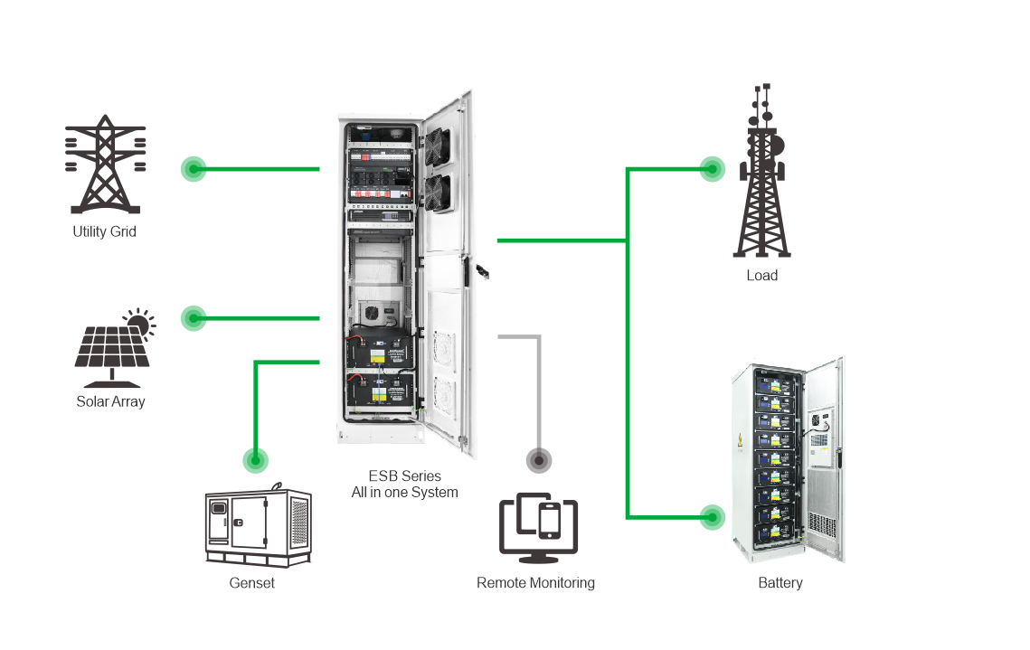 Nossos sistemas retificadores de telecomunicações da série ESB, recém-desenvolvidos, foram projetados com o conceito de um "sistema de energia multifuncional integrado para estações base". Eles incluem módulo retificador, módulo MPPT solar, inversor, bateria de lítio, módulo de monitoramento, ar condicionado, PDU (Unidade de Distribuição de Energia) e gabinete da estação base em uma única plataforma, fornecendo uma solução completa de infraestrutura para a construção de sistemas de estações base. Assim como neste projeto, podemos personalizar todos os tipos de sistemas retificadores de telecomunicações da série ESB de acordo com os requisitos do projeto do cliente, oferecendo maior flexibilidade, confiabilidade e custo-benefício.