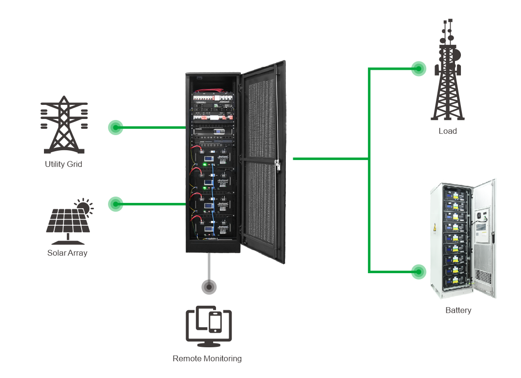 Os sistemas retificadores de telecomunicações personalizados da série ESB são projetados com o conceito de um "sistema de energia multifuncional integrado para estações base". Isso inclui o módulo retificador, o módulo MPPT solar, o inversor, a bateria de lítio, o módulo de monitoramento, a PDU (Unidade de Distribuição de Energia) e o gabinete da estação base em uma única plataforma.