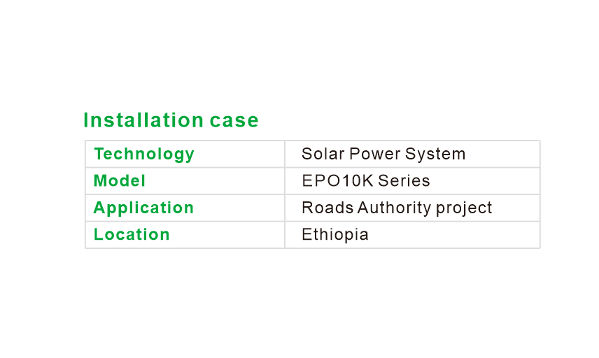 Este projeto foi desenvolvido para a Autoridade Rodoviária Etíope. Ele visa melhorar a operação dos postos de controle rodoviário, combatendo as frequentes interrupções de carga causadas por problemas na rede elétrica local, quedas de energia e picos de tensão instáveis nas proximidades dos postos. A configuração do sistema de energia solar em cada local consiste em painéis solares monocristalinos de alta eficiência, um inversor híbrido de 10 kW, um banco de baterias tubulares OPzS em gabinetes externos com classificação de proteção IP55 e um gerador a diesel.