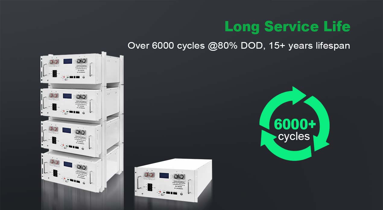 Células LiFePO4 de grau A, mais de 6000 ciclos, vida útil de 15 anos. Extintor de incêndio integrado para maior segurança. Certificado e ecológico.