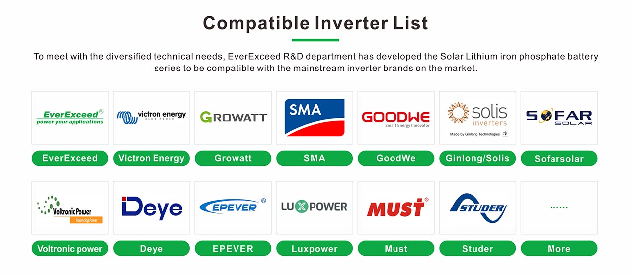 BMS inteligente com proteção completa. Compatível com RS232, RS485 e CAN. Funciona com a maioria das marcas de inversores.
