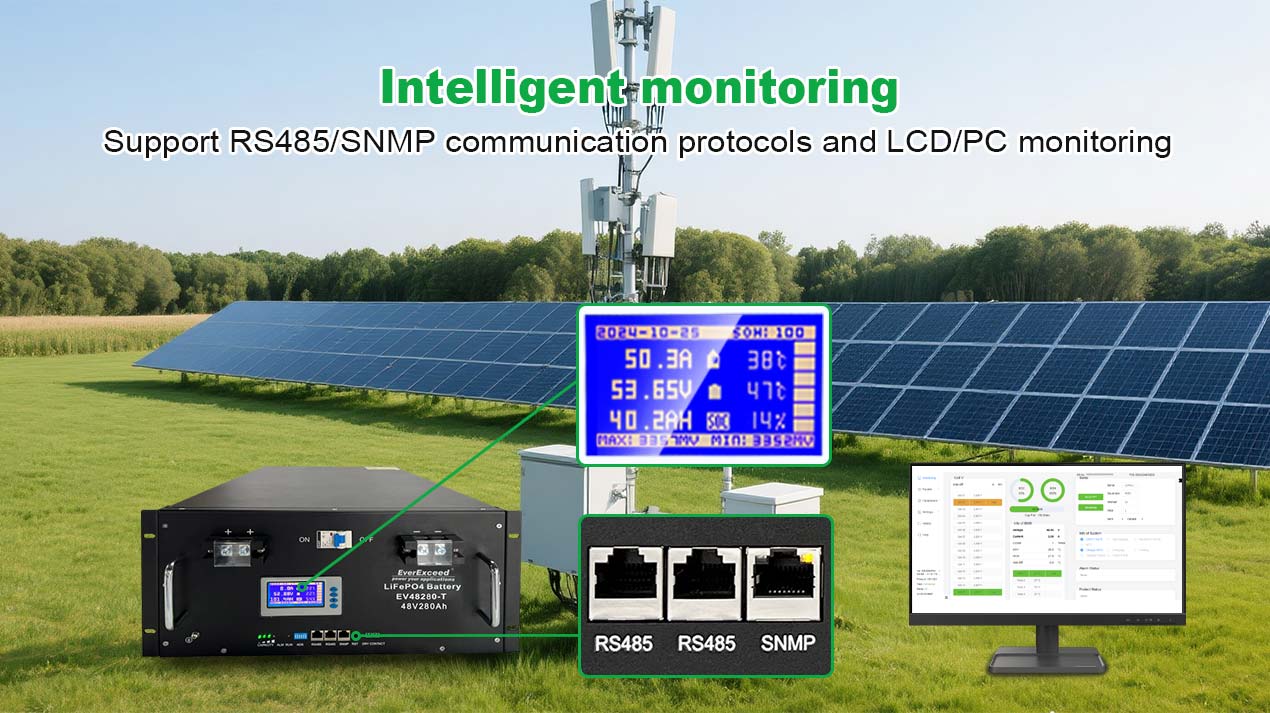 Este sistema possui um BMS inteligente integrado para proteção de 100%, suporta Modbus via RS485 e permite monitoramento remoto SNMP/GPRS, garantindo supervisão em tempo real 24 horas.