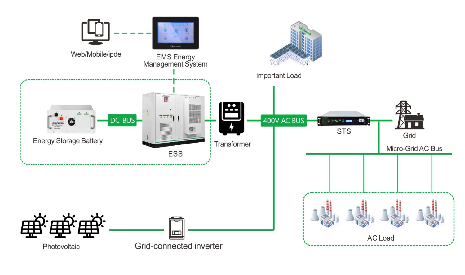 O sistema de armazenamento de energia EverExceed EverPower C&I foi projetado especificamente para solucionar os desafios do consumo de energia fotovoltaica. Ao armazenar a energia gerada por painéis fotovoltaicos diretamente no sistema de baterias e descarregá-la para as cargas locais durante a noite, ele melhora efetivamente a utilização da energia fotovoltaica, suaviza os perfis de carga do usuário e reduz os custos gerais de eletricidade.