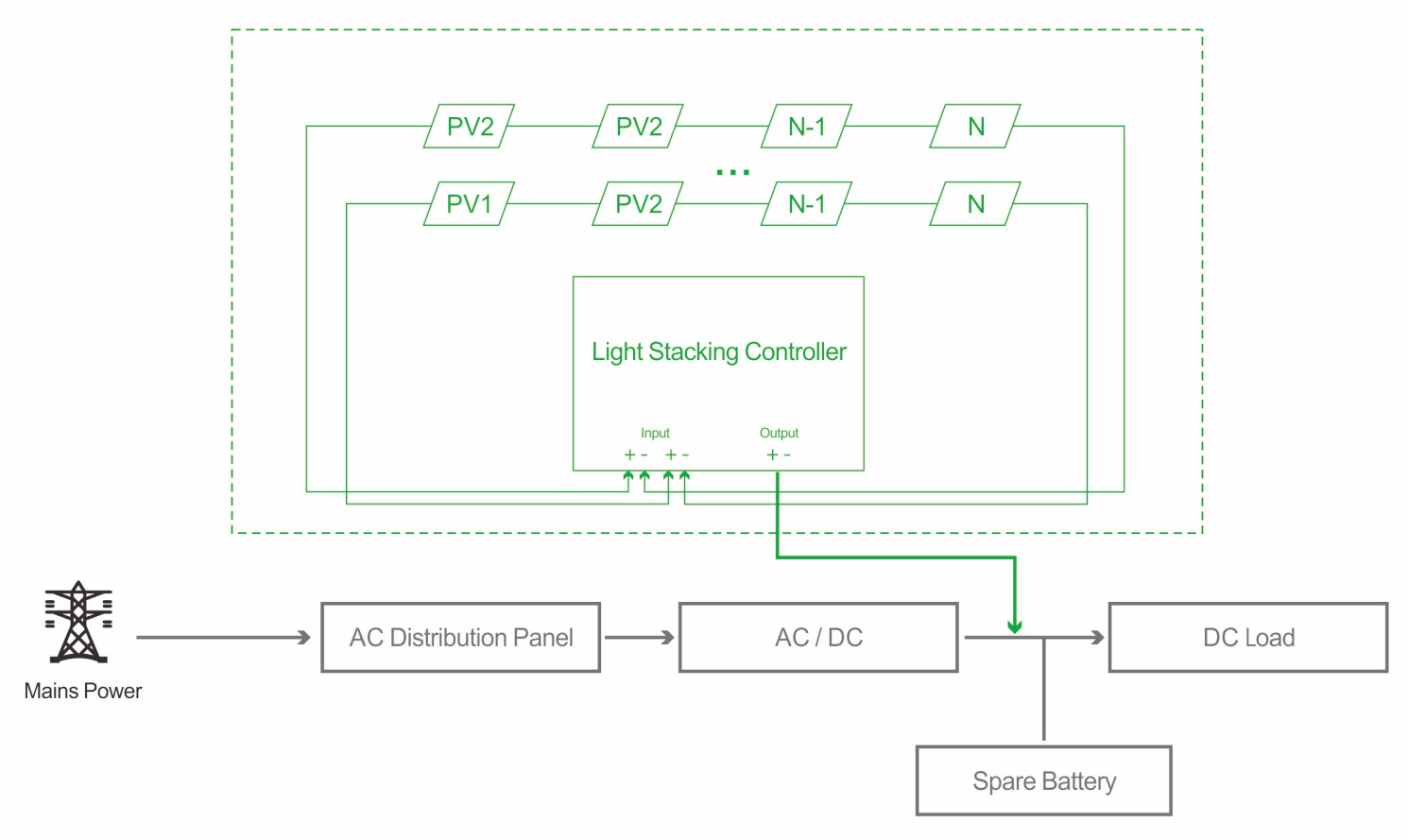 O PV-Overlay integra um sistema fotovoltaico adicional à arquitetura de energia existente de uma estação base de telecomunicações, possibilitando o fornecimento de energia híbrida “FV + Rede Elétrica”.